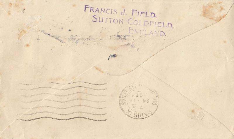 Unusual Plain Cover......... with Francis J Field address cachet on the rear.... (Open Top)...