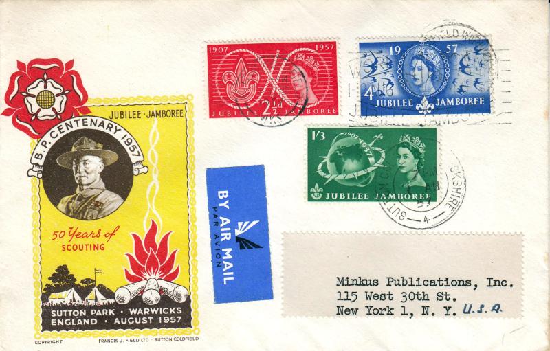 1957 (08) Scouts - Francis J Field 'Yellow' Cover - World Scout Jamboree Slogan + Sutton Coldfield CDS