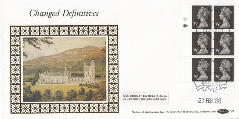 1988 (02) 2p + 75p Litho Printing Definitives - Pair of Benham D77's - Both Cyl No Panes - Buckingham Palace Front View H/S (2p Block) + Windsor Counter H/S (75p Block)