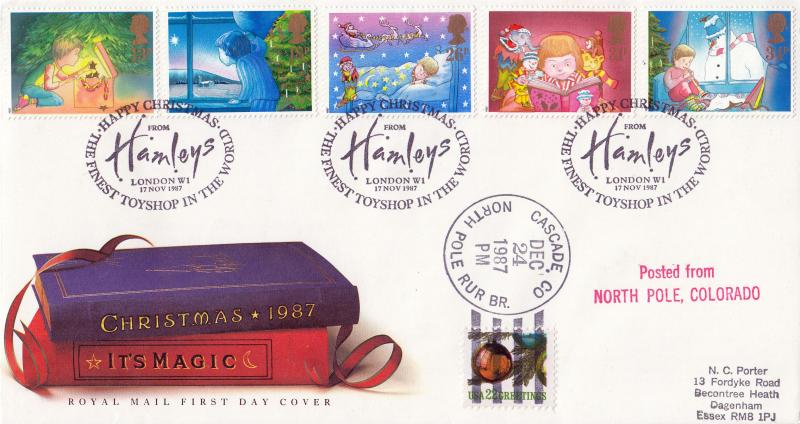 Unusual Royal Mail cover........... Hamley's H/S. Doubled at North Pole, Colorado.